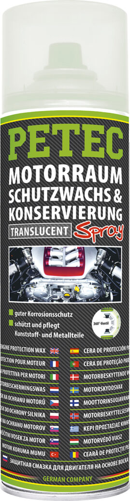 PETEC Motorraumschutzwachs & Konservierung ist eine Hochglanzversiegelung und ein Korrosionsschutzmittel. Schütz, pflegt und versiegelt den Motorraum und viele weitere Teile. Schützt zuverlässig vor Korrosion, Schmutz, Nässe und Kriechströmen.