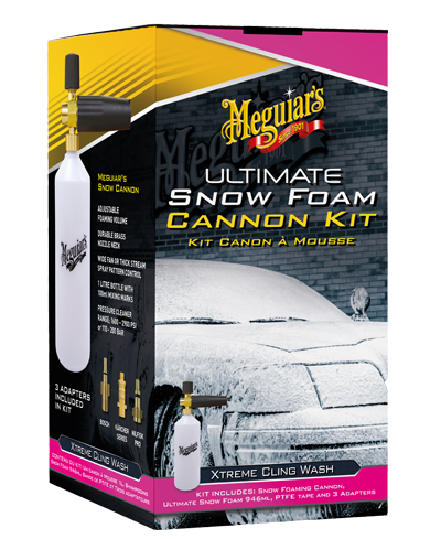 Meguiar's Ultimate Snow Foam Cannon Kit sadrži i Snow Foam Cannon i pjenu Xtreme Cling Ultimate Snow Foam koja štiti voskom. Kada se koristi s odgovarajućim visokotlačnim peračem, ova kombinacija pruža izvrsnu formaciju pjene i prianjanje na površinu kako bi nježno uklonila cestovnu prljavštinu i druge nečistoće. Vratite sjaj i intenzitet boje vaše karoserije pomoću ovog kompleta Snow Foam Cannon – i to sve bez uklanjanja zaštite voskom! Meguiar's Ultimate Snow Foam posebno je osmišljen za obložene, voštane ili zapečaćene površine te čisti bez uklanjanja brtvila.